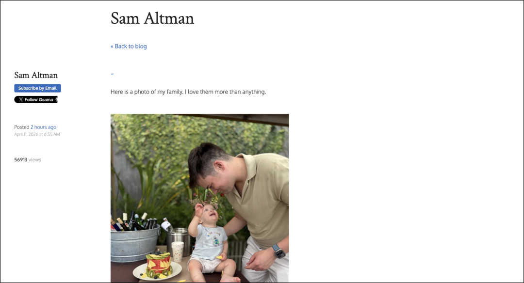 奥特曼在博客中公开了一张他和伴侣、儿子的合照,并写到,“这是我家人的照片。他们是我的一切。”他解释为什么要公开这张平时刻意藏起来的照片:“希望能让下一个人在冲我家扔燃烧瓶之前三思,无论他们对我有什么看法。”
